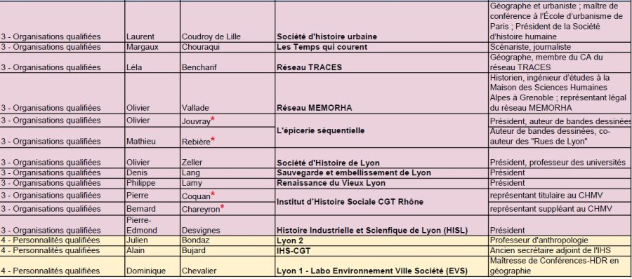 C’est dans les établissements et personnes qualifiés, représentant près des deux tiers de l’ensemble, qu’on découvre, à côté de participations tout à fait légitimes comme la Renaissance du Vieux Lyon et la Société d’histoire de Lyon, d’autres qui peuvent interroger.