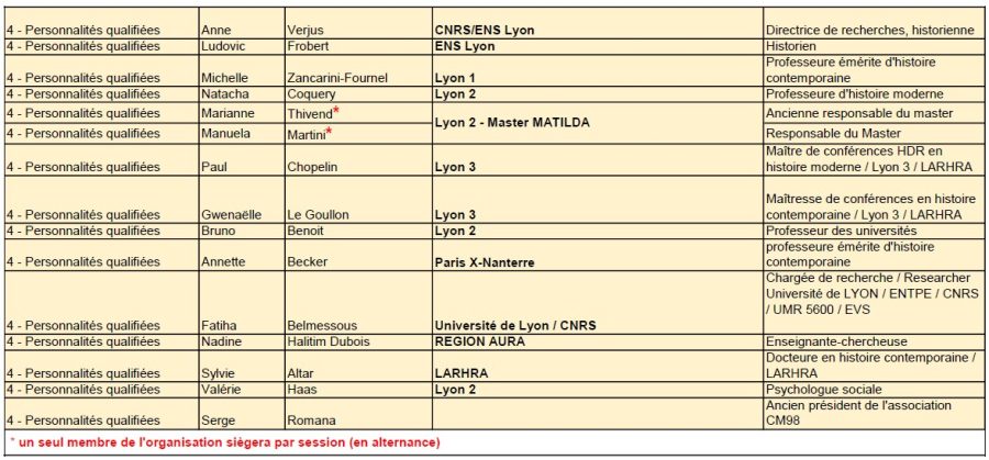 Le Comité Histoire et Mémoire dans la Ville, puisque tel est son nom, comprend en théorie 48 membres se répartissant en 4 groupes : 12 institutions publiques, 6 communautés universitaires, 12 organisations qualifiées et 18 personnalités qualifiées. Les noms et qualités de chacun ont été, dans un premier temps, cachés au public, la Mairie ne répondant pas aux questions à ce sujet. Le travail doit également rester discret ; on sait pourtant qu’il y aura encore plusieurs sessions.