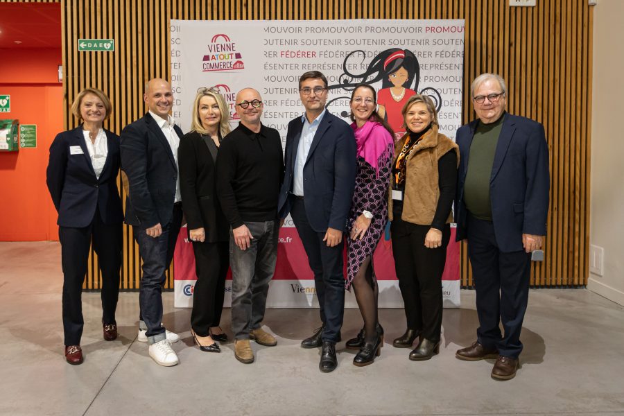 6. Maryline Sylvestre (Adjointe au Maire – Vienne), Christophe Carron (Président de la CCI Nord Isère, Corinne Paris (Présidente d’honneur Vienne Atout Commerce), Hervé Peyrache (Président Vienne Atout Commerce), Thierry Kovacs (Maire de Vienne) , Hélène Papadopulo (Vice-présidente CCI Nord Isère, Virginie Novotny (Directrice générale de CCI Nord Isère), Daniel Paraire (Adjoint en charge de l’économie et de l’emploi à la mairie de Vienne)