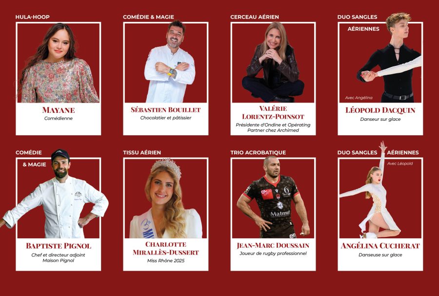 Cette année, huit volontaires monteront sur scène pour proposer des numéros inédits. La comédienne Mayane s’essaiera au hula-hoop, le chocolatier Sébastien Bouillet et Baptiste Pignol mêleront comédie et magie, tandis que le rugbyman Jean-Marc Doussain participera à un trio acrobatique. Miss Rhône 2025 Charlotte Mirallès-Dussert se lancera dans un numéro de tissu aérien, alors que les danseurs sur glace Léopold Dacquin et Angelina Cucherat évolueront en duo aux sangles aériennes. Enfin, Valérie Laurentz-Poinssot prendra de la hauteur au cerceau aérien.