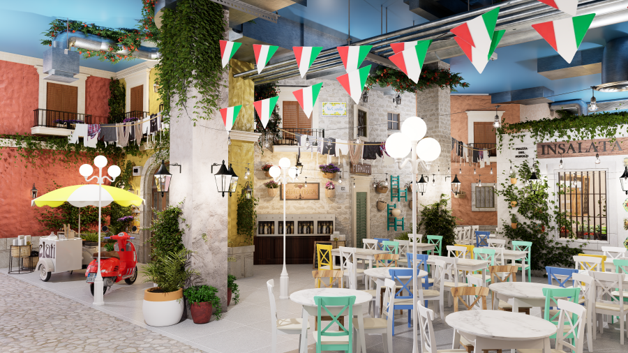 Sur près de 1 900 m² d’espace intérieur et 500 m² de terrasse, IT Villaggio prendra la forme d’un village festif inspiré des ruelles et des places d’Italie. Plusieurs comptoirs thématiques évoqueront les grandes villes transalpines : pasta, pizza napolitaine, grillades à la florentine, bar romain ou encore glacier artisanal.