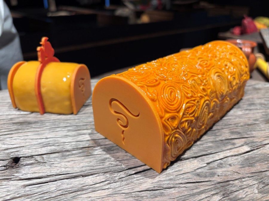 Vient ensuite un périple en Thaïlande, terre de rencontres avec des agriculteurs locaux et de dégustations des iconiques Mango Sticky Rice. De là, apparaît une bûche exotique, d’ores et déjà disponible en précommande. À l’intérieur, les clients auront le plaisir de découvrir un insert de « mangues rôties », un gel coco frais et une crème onctueuse au riz vanillé, posée sur une dacquoise aux amandes ».