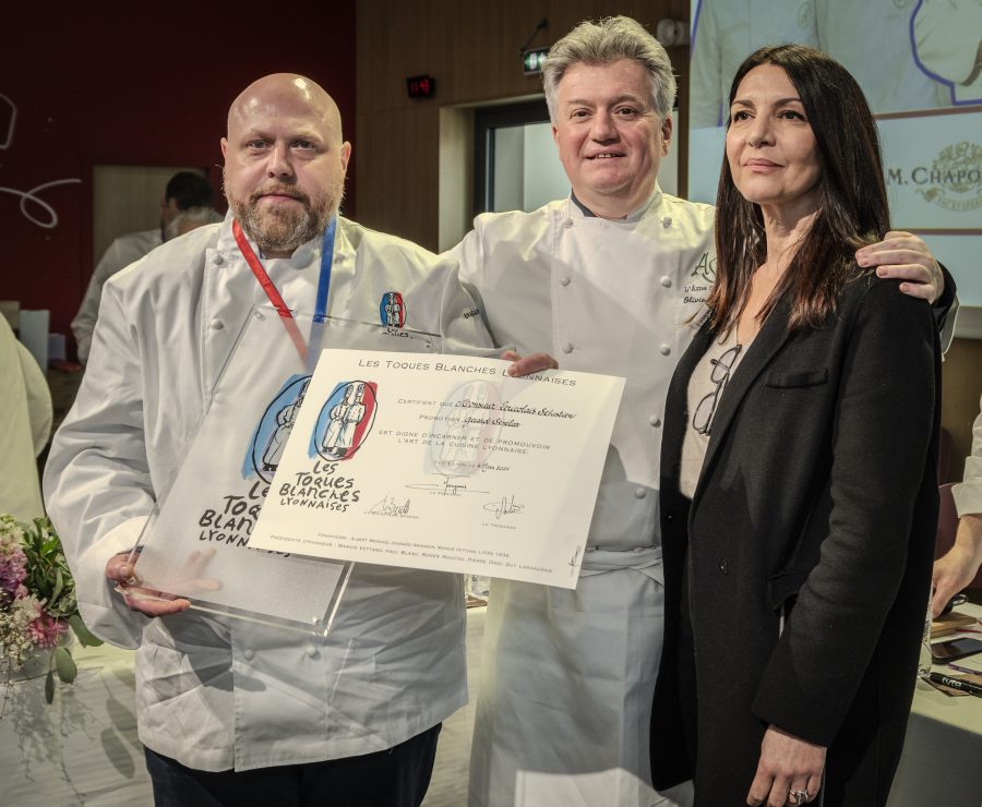 123. Joseph Viola (Daniel & Denise), Olivier Fuchs (La Cave d’Olivier Fuchs) et Christophe Marguin, président des Toques Blanches Lyonnaises