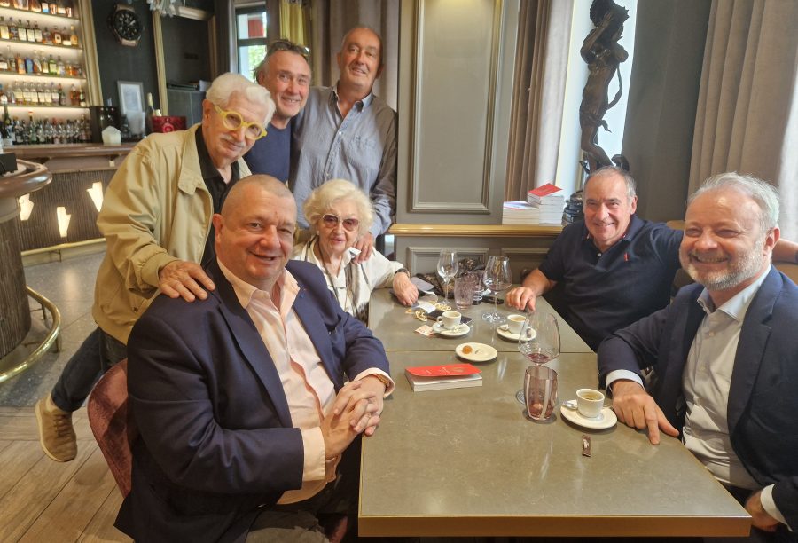 De g à d : Le chef Christophe Marguin, Colette Sibilia, le père Patrick Rollin et Marco Polisson, rédacteur en chef de Lyon People. Debout : les grenouilles de bénitier Jacky Marguin, Thierry Gardon et Pierre Nallet.
