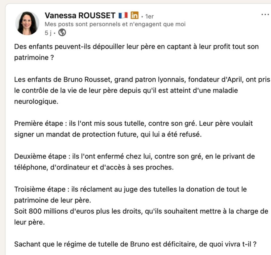 Inquiète pour le sort présent et futur de Bruno Rousset, et sans doute poussée par le sentiment d’être le pot de terre contre le pot de fer, Vanessa Rousset a fait le choix de rendre publique cette affaire privée sur LinkedIn, en publiant il y a quelques jours un nouveau post sur la situation de son ex-mari. Le 27 novembre 2024, elle avait déjà publié un premier post, appelant à l’aide ses amis, ses anciens collaborateurs, ses proches, sur la situation « d’enfermement » de Bruno Rousset, post lu et commenté à de très nombreuses reprises.
