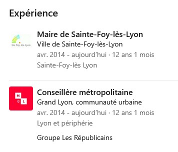 Elle a été élue présidente de la Métropole de Lyon sous l’étiquette Grand Cœur Lyonnais, le 26 mars 2026. Cette nouvelle fonction ne figure toujours pas sur son profil LK (compte personnel) où elle apparait encore comme maire de Sainte-Foy-lès-Lyon et simple conseillère métropolitaine. Une mise à jour s’impose.
