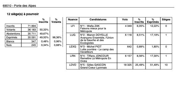 Porte des Alpes, le maire de Saint-Priest, réélu sur sa commune, doublerait le plaisir puisque les premiers résultats (sur le base de 25% des inscrits) le donnent largement gagnant avec 53,76%, loin devant Tiffany Joncour (24,85%) et l’écologiste Marion Doyelle (13,92%)