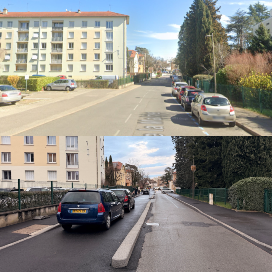 Avec plus de 13 000 passages quotidiens sur cet axe, Champagne-au-Mont-d’Or avait d’ailleurs l’image de « village rue ». La suppression de places de stationnement a renforcé cette impression, s’arrêter devenant un vrai casse-tête, constat à l’appui. Même le marché, jadis organisé sur la place, à l’angle de la rue Louis Juttet et de l’avenue de Lanessan a été déplacé pour remodeler ladite place, désormais « végétalisée ».