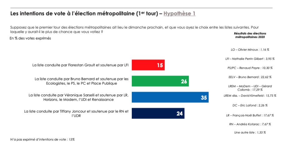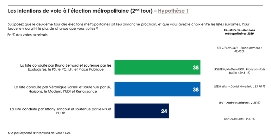 Dans une lutte à quatre avec Tiffany Joncour (UDR -RN) et Florestan Groult (LFI), c’est toutefois Véronique Sarselli, forte de son alliance de la droite et du centre, qui apparaîtrait en tête (35%). Sans trop avoir avancé ses pions, la maire de Sainte-Foy-lès-Lyon devancerait alors Bruno Bernard (26%), le Rassemblement National (24%) et LFI (15%).