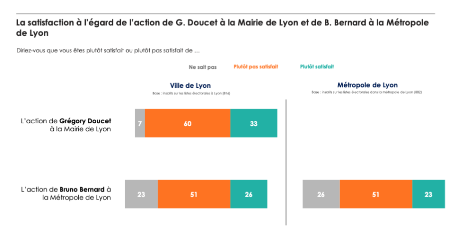 L’action de Grégory Doucet à la tête de la Mairie de Lyon est même jugée insatisfaisante par 60% des personnes interrogées. Malgré les millions d’euros dépensés en communication, Bruno Bernard, s’en sort à peine mieux (51%). Pour une équipe sortante, ce sont des scores très faibles.