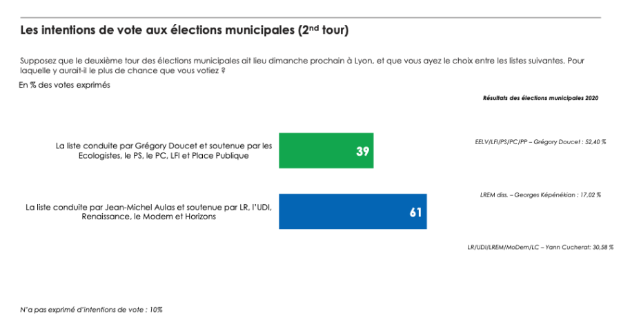 Cette étude vient corroborer la tendance du moment : les Lyonnais attendent beaucoup de la candidature de Jean-Michel Aulas, largement en tête des intentions de vote au 1er tour. En cas de fracture de la gauche, le candidat du mouvement Cœur Lyonnais récolterait 47% des suffrages, loin devant Grégory Doucet (23%) et la liste LFI, vraisemblablement conduite par la députée Anaïs Belouassa-Cherifi (15%).