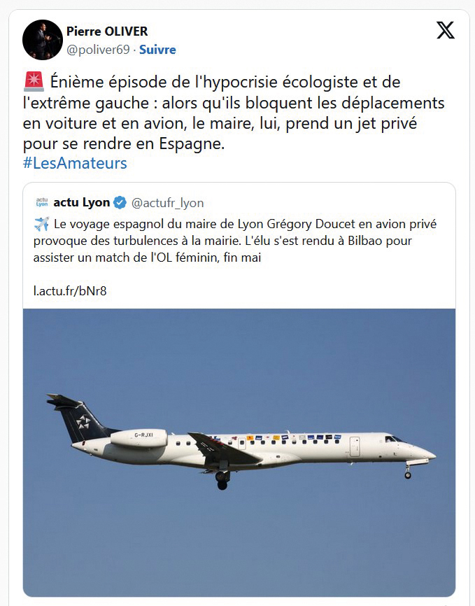 Mis devant le fait accompli, le maire de Lyon et son équipe ont d’abord tenté de justifier ce déplacement, par une invitation à bord d’un « avion de ligne régional », de 150 places, en compagnie des « joueuses blessées et des familles ». Une justification qui s’est finalement avérée être inexacte, l’édile se trouvant à bord d’un autre avion, de… 49 places, en compagnie de partenaires et sponsors de club. Pris à partie par l’opposition, incarnée par Pierre Oliver, lors du conseil municipal du 30 mai 2024, le maire écolo avait péniblement défendu sa cause, arguant que sa « place en tant que maire était à leurs côtés » et qu’il n’effectuait qu’un seul déplacement par an.