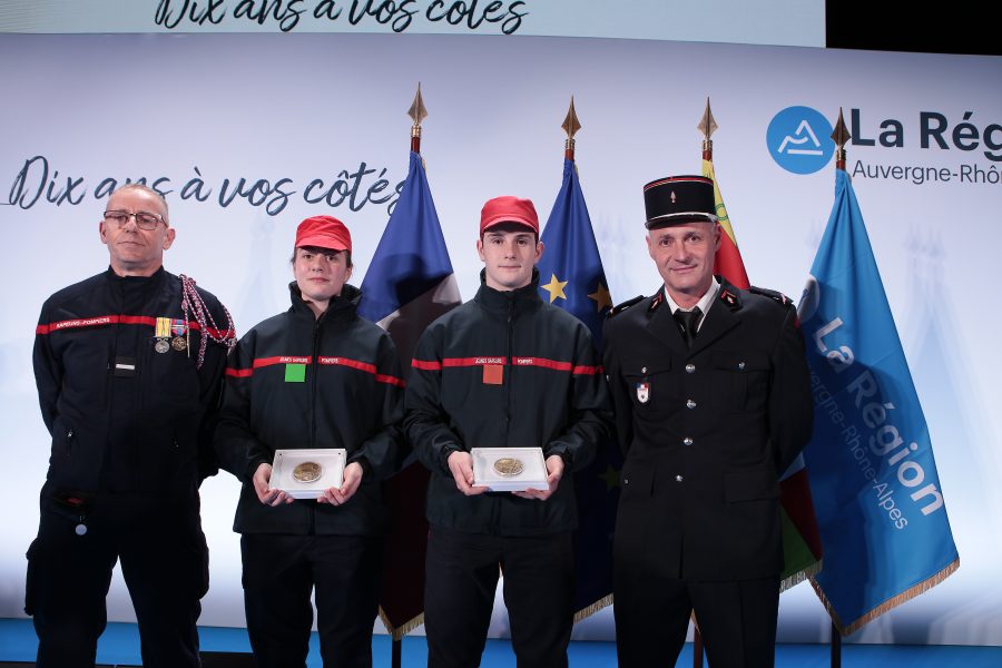 2. Katia Paillasson et Alexis Vigier (association des jeunes sapeurs-pompiers du Rhône) honorés par la Région, entourés de l’adjudant-chef Alexandre Comment et du sergent Laurent Guilhermet,