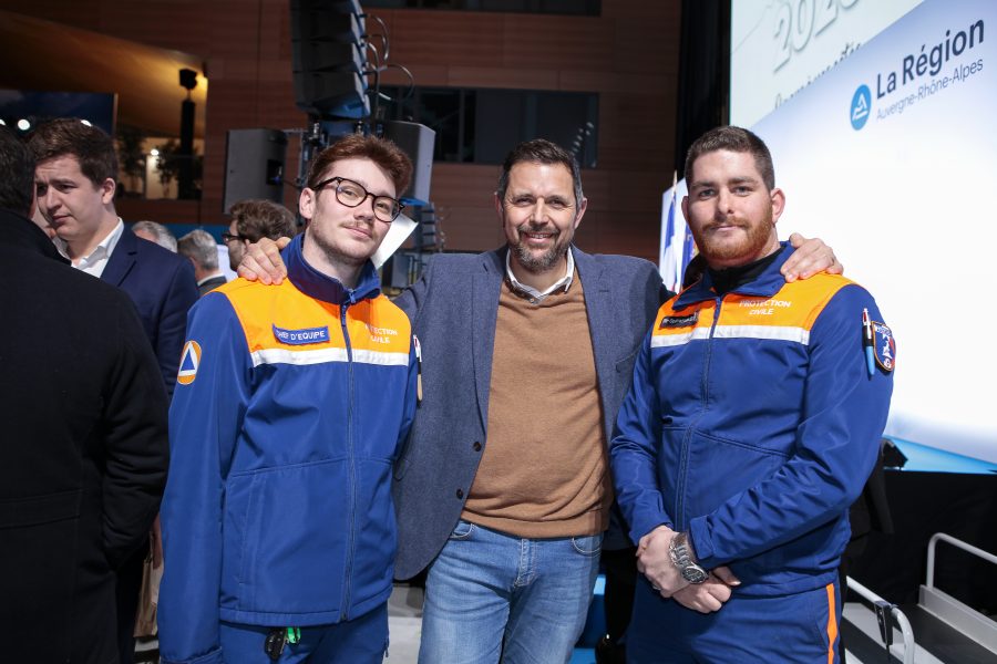 9. Olivier Amrane, vice-président à la Région Auvergne-Rhône-Alpes entouré de Tom Davail et Florian Duperrier (La Protection Civile de l’Ardèche)