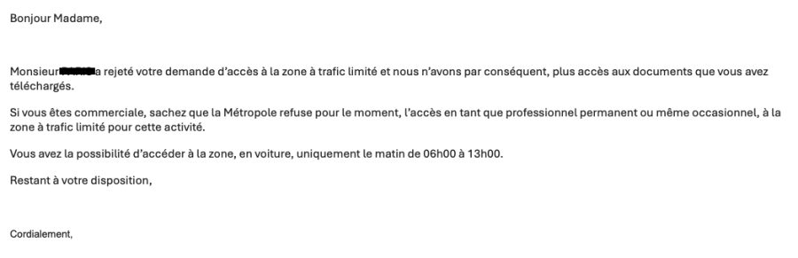 Mail à l’appui, Catherine en apporte la preuve. « Si vous êtes commerciale, sachez que la Métropole refuse l’accès en tant que professionnel permanent ou même occasionnel, à la zone à trafic limité pour cette activité. Vous avez la possibilité d’accéder à la zone, en voiture, uniquement le matin de 06h00 à 13h00 », lui écrit le service Relation Clients de LPA. « Mais moi, les réunions se font le soir ou le week-end », rétorque-t-elle.