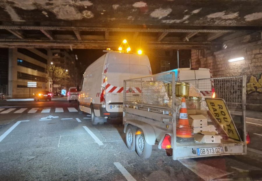 Angle avenue Verguin – boulevard Stalingrad, le 17 mars. Les ouvriers interviennent en pleine nuit sur l’autoroute à vélos.