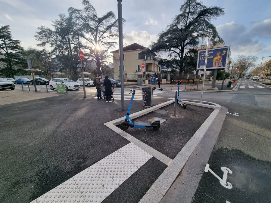 Alertés par plusieurs lecteurs (et piqués dans notre curiosité), nous sommes retournés avenue Jean-Mermoz pour examiner la situation de plus près. Sur place, nuance : si certaines places sont bien destinées au stationnement des trottinettes, l’une d’entre elles (photo ci-dessous) ne comporte aucun marquage au sol ni panneau spécifique indiquant un usage réservé. Une voiture y est d’ailleurs stationnée en toute logique, ce qui contraint effectivement les automobilistes à empiéter légèrement sur la piste cyclable pour circuler.