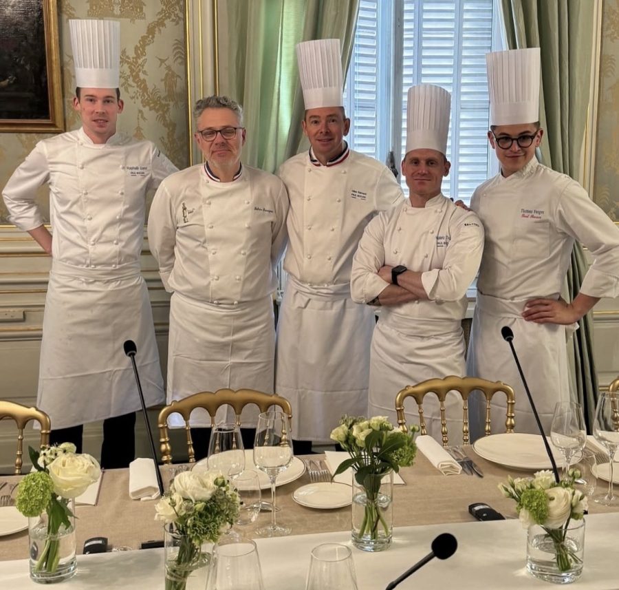 A suivre en plat principal, une volaille de Bresse à l’estragon, pomme lyonnaise, conclue par un jardin d’agrumes. Toutes les assiettes sont revenues « lessivées » à la plus grande joie de l’équipage de Collonges (Gilles, Raphaël, Fred et Thomas avec le sommelier Thibaut Curioz). Mais Emmanuel Macron n’est pas Édouard Herriot : pas question de traîner à table. Le déjeuner a été envoyé par le directeur de salle Louis Morin, ses 15 collaborateurs et les chefs, épaulés par C Gastronomie, en 45 minutes chrono, douche comprise.