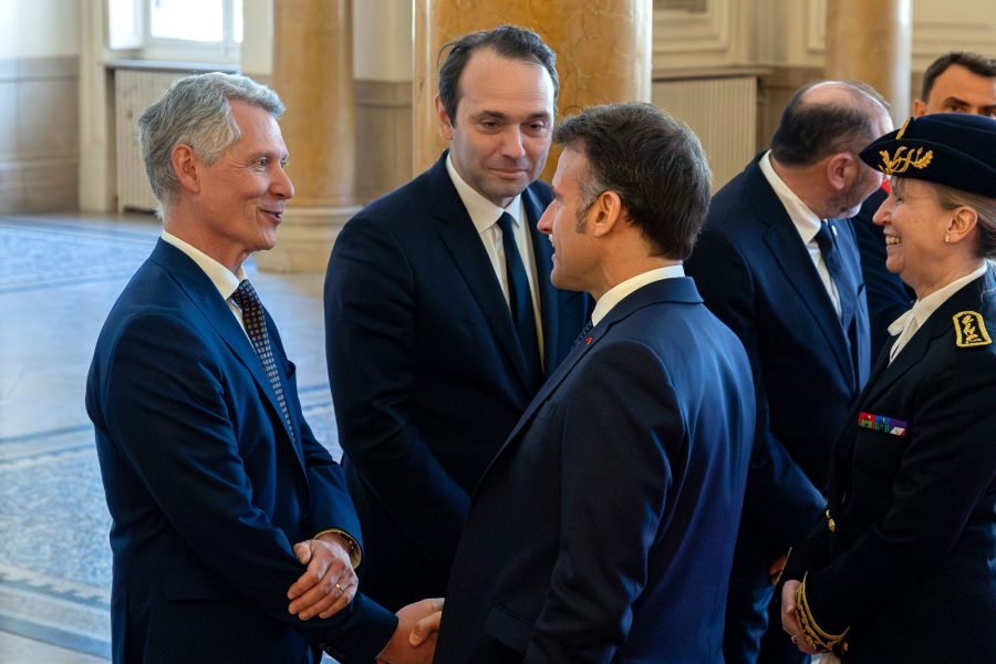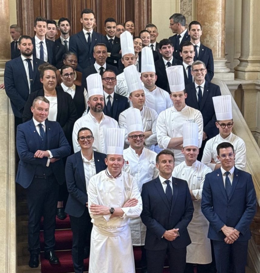 A l’issue du repas, le chef de l’État a pris le temps de présenter les chefs Bocuse – qui l’avaient déjà régalés à l’Elysée le 26 mars dernier – à ses hôtes, avant de poser avec toute la team dans l’escalier d’honneur et de filer à l’anglaise au Centre de Congrès,où il a été accueilli par Olivier Ginon (ci-dessous)