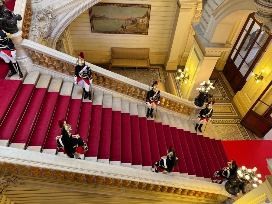 Déjeuner ultra private. Après avoir quitté les élus, le président de la République grimpe l’escalier d’honneur sous le regard impassible des gardes républicains (ci-dessus) pour rejoindre les chefs de gouvernement et d’institutions et participer notamment à une réunion sur l’architecture de la santé mondiale, réunissant les grands acteurs internationaux pertinents pour la mise en œuvre de l’approche « une seule santé » (États, organisations internationales, secteur privé, société civile, chercheurs).