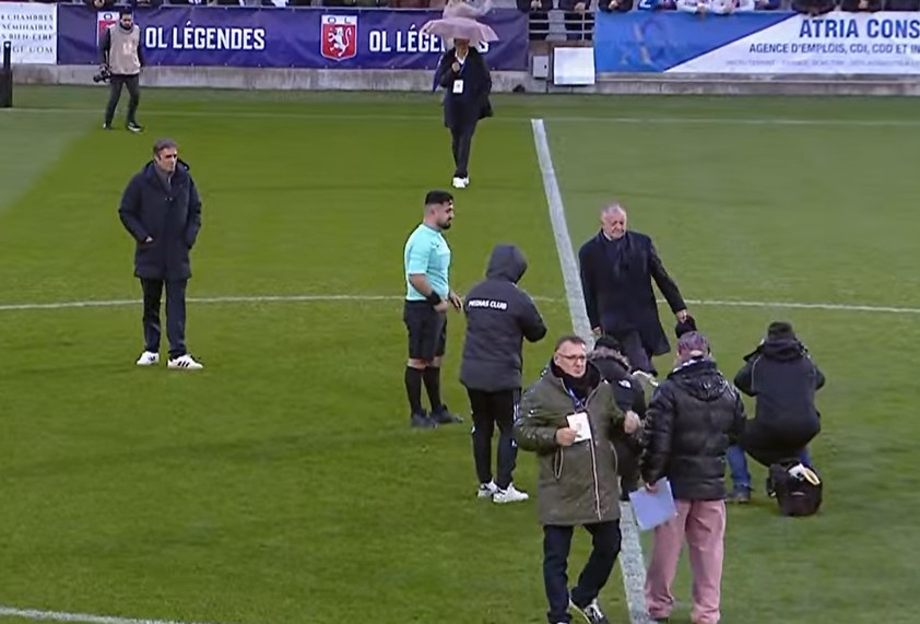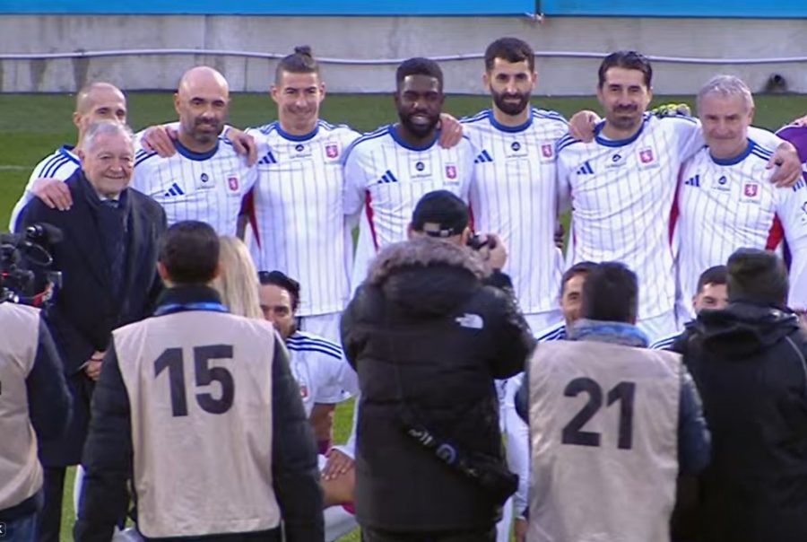 JMA accueilli par les anciennes gloires de l’OL avant le début du match – Capture d’écran YouTube Olympique Lyonnais