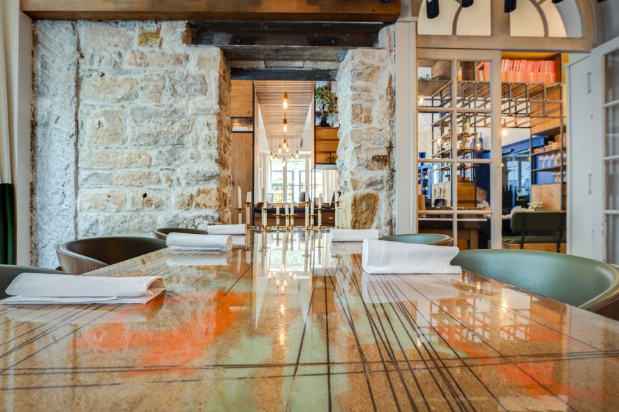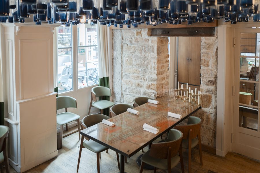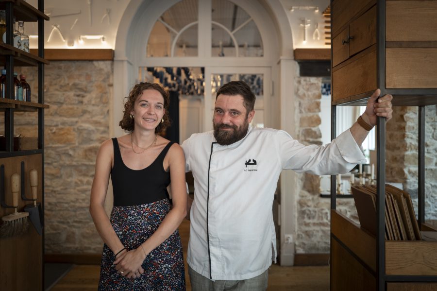 L’endroit respire chaleur et lumière, modernité et tradition, pierre, bois et métal brut, mais aussi cuir vert pastel des chaises et banquettes. Ici un plafond de bouteilles aux culs bleu de mer, là un mur d’outils stylisé, un bar pour la sommellerie, les tables sont belles, on souffle, c’est feutré et convivial… Et puis il y a Manon, Manon Casier, le sourire en accroche et la pointe d’humour qui soulage.