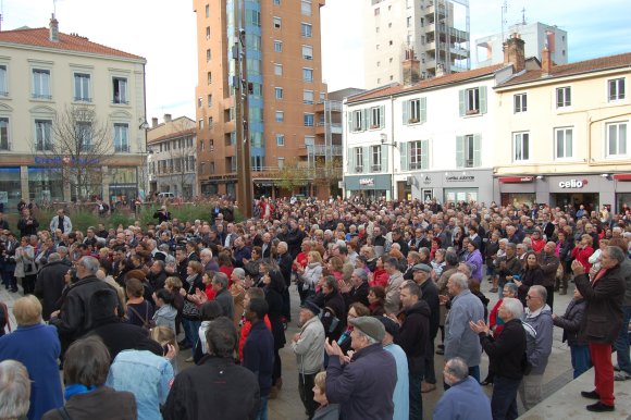 Près d’un millier d’oullinois se sont rassemblées samedi 9 novembre 2013 à Oullins pour protester contre la réquisition d’un terrain de la ville pour accueillir 296 demandeurs d’asile albanais.