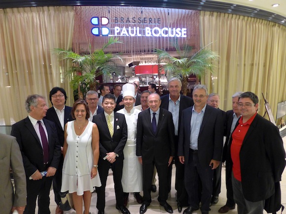 Direction Nagoya en Shinkansen, le TGV japonais survitaminé aux allures d’engin spatial. Un gare de plus à visiter pour la mission Part-Dieu. « On ne peut pas dire que l’on va transposer la totalité du modèle à la Part-Dieu, mais il y a de bonnes idées à piocher », explique Collomb. La plateforme ferroviaire s’apparente, comme ses cousines tokyoïtes, à un immense centre commercial. Mais à la différence des gares nippones visitées, elle est surplombée d’un building de 52 étages. Là encore, dans les hauteurs, les commerces sont partout. Et c’est au 12e étage de cet ensemble immobilier que Paul Bocuse a installé sa brasserie « La Maison », où l’écharpe de l’OL trône en bonne place à l’entrée du restaurant. Passage obligé pour la délégation. Didier Nadal (ERDF Lyon), Philippe Grillot (CCI), François Turcas (CGPME), Jean-Marc Bador (ONL), François Gaillard (Only Lyon Tourisme et Congrès), Thomas Barrillon et Ronand Goupil (Chemsis), ont pu retrouver un peu de Lyon malgré la distance. La délégation emmenée par « Gares et Connexions » était également de la partie, et retrouvera pour des rendez-vous économiques communs celle du Grand Lyon vendredi à Séoul.