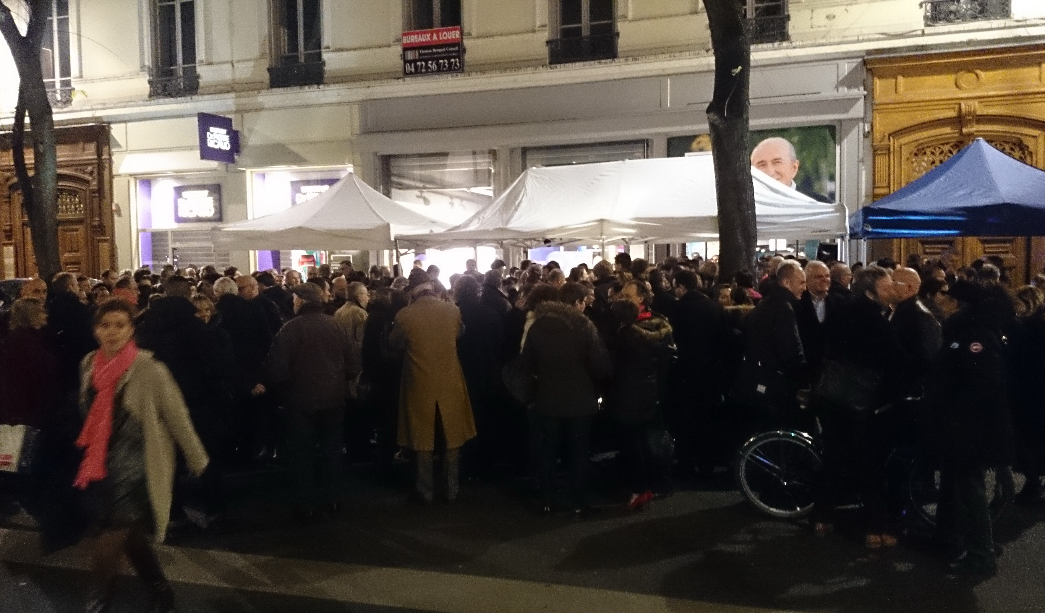 Au bras de son épouse Caroline, dont on dit qu’elle pourrait diriger la campagne de Thomas Rudigoz sur le 5e arrondissement, l’édile a fendu une foule dense avant d’arriver au lutrin. Une arrivée de boxeur, le peignoir de soie en moins, pour un Collomb résolument déterminé à puncher. A l’extérieur, des centaines de personnes ne peuvent accéder ne serait-ce qu’au seuil du local. L’adjoint à la culture Georges Képénékian joue les portiers d’un soir, l’Acteur de la Ville Yann Cucherat étire sa musculature de gymnaste pour tenter de voir Collomb au micro, tandis que le potineur Gérard Angel, impeccable dans son manteau 100% cachemire, tente de cacher sa dissipation sous son feutre. « Je n’ai rien écouté », nous confiera-t-il l’exercice du maire terminé.