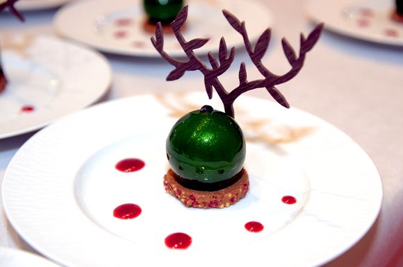 69. L’Olivier, dessert, réalisé par le chef pâtissier Sébastien Bouillet. Mousse au chocolat parfumée à l’huile d’olive, coulis Muroise, croustillant framboise