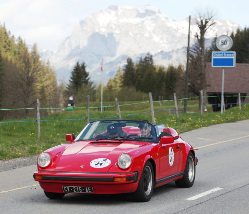 14. Une Mercedes 300 SLS précède une Ferrari California au Pas de Morgins, un col à 1 369 m situé à la frontière franco-suisse, entre le département de la Haute-Savoie et le canton du Valais.